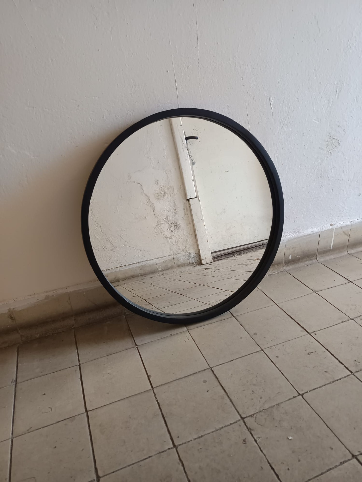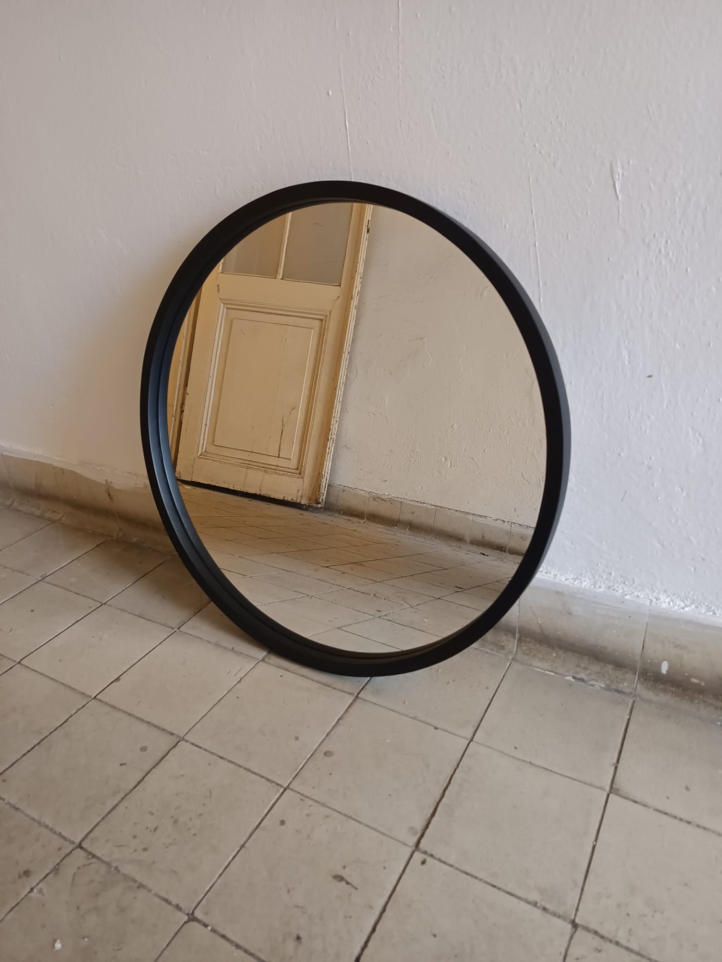 Kulaté zrcadlo v ručně vyrobeném dřevěném rámu v černé barvě.