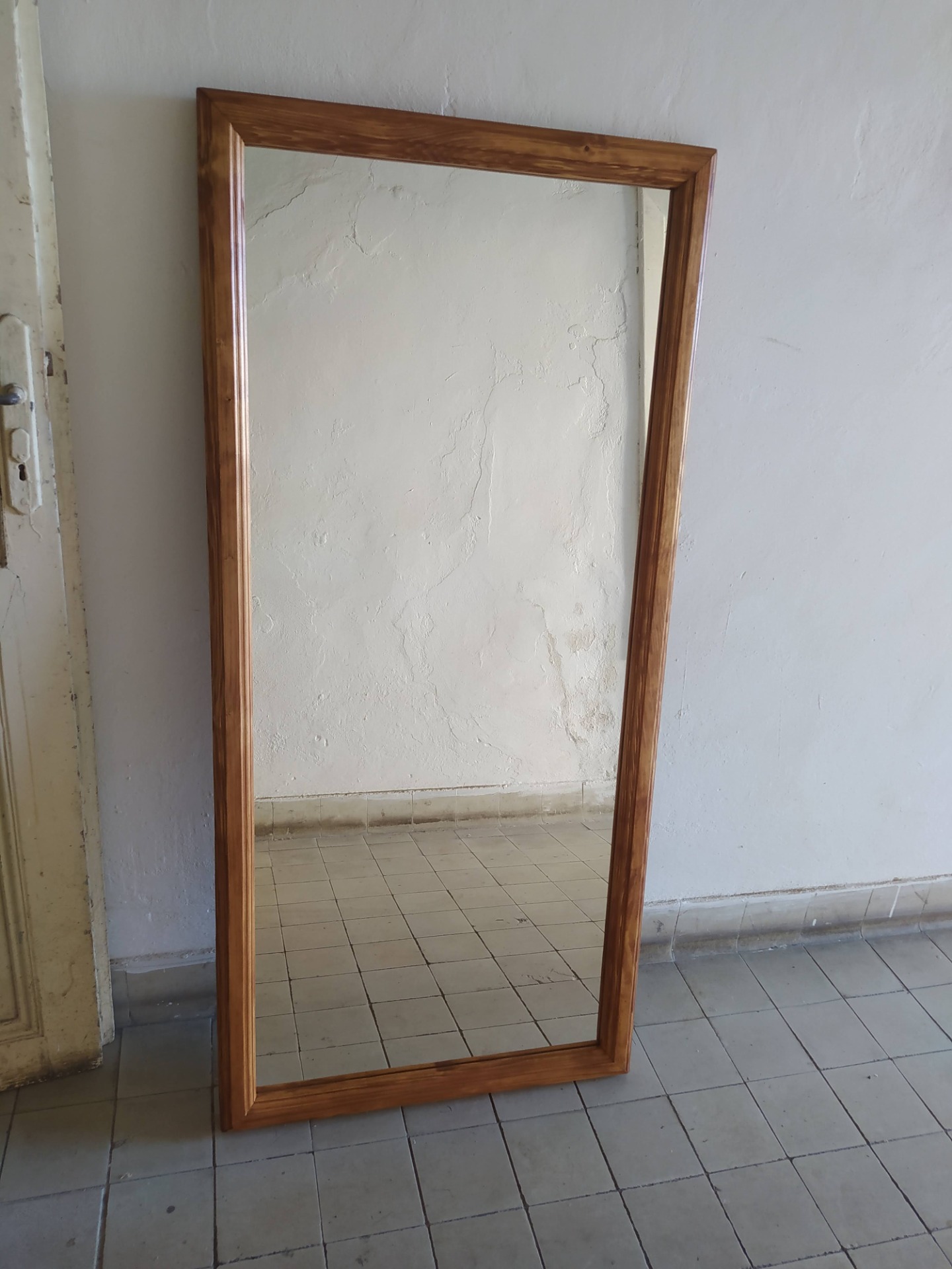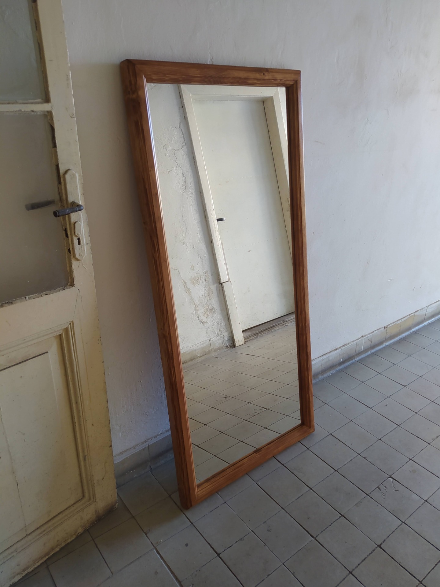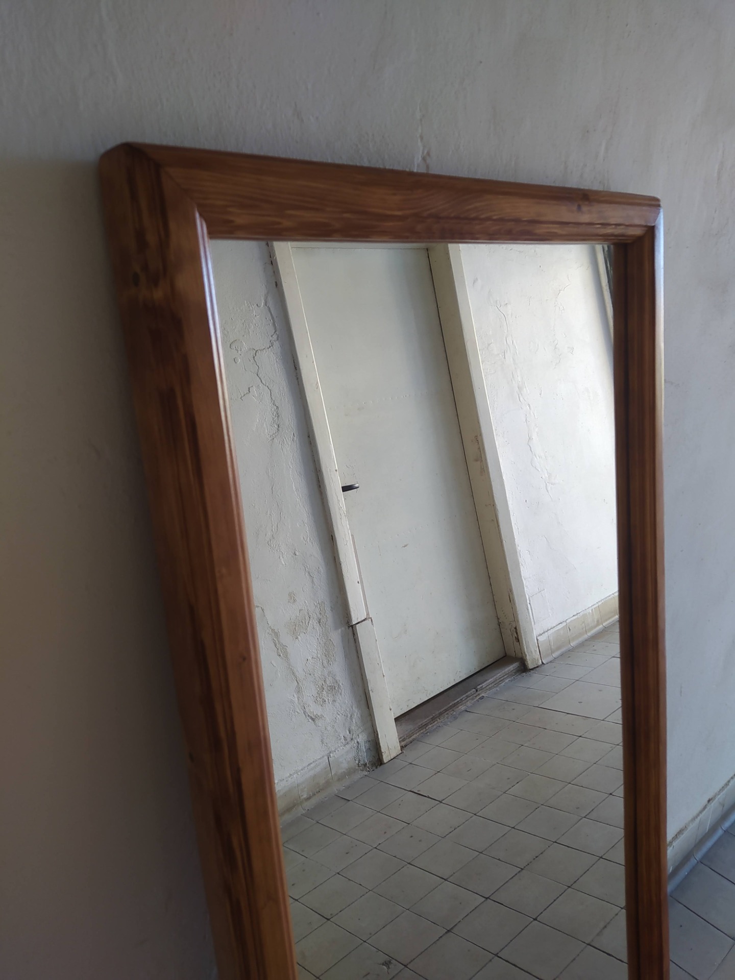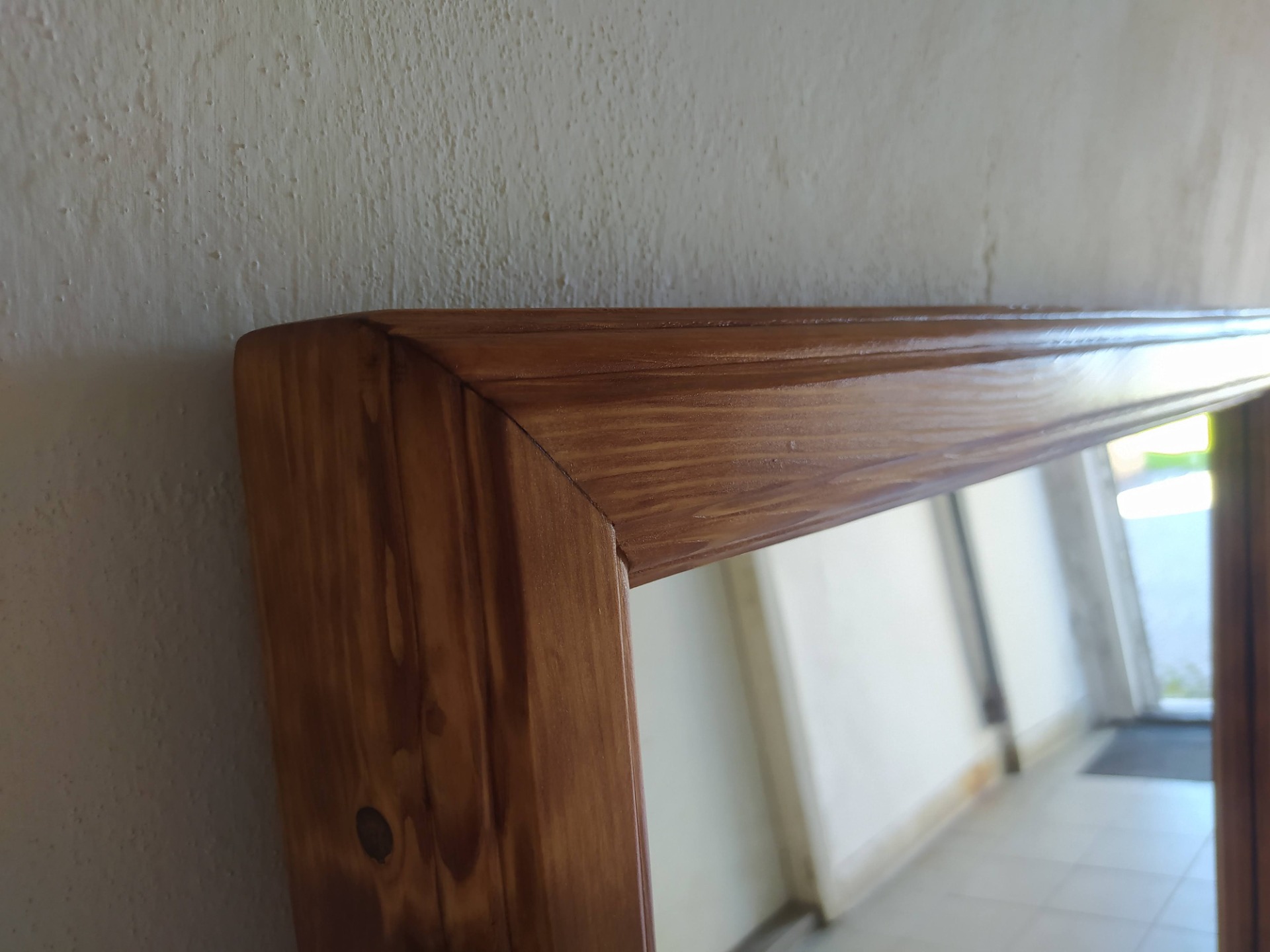 Zrcadlo v dřevěném rámu, který je ručně profilovaný a broušený. Součástí jsou také úchyty pro zavěšení. Rám je lakovaný.