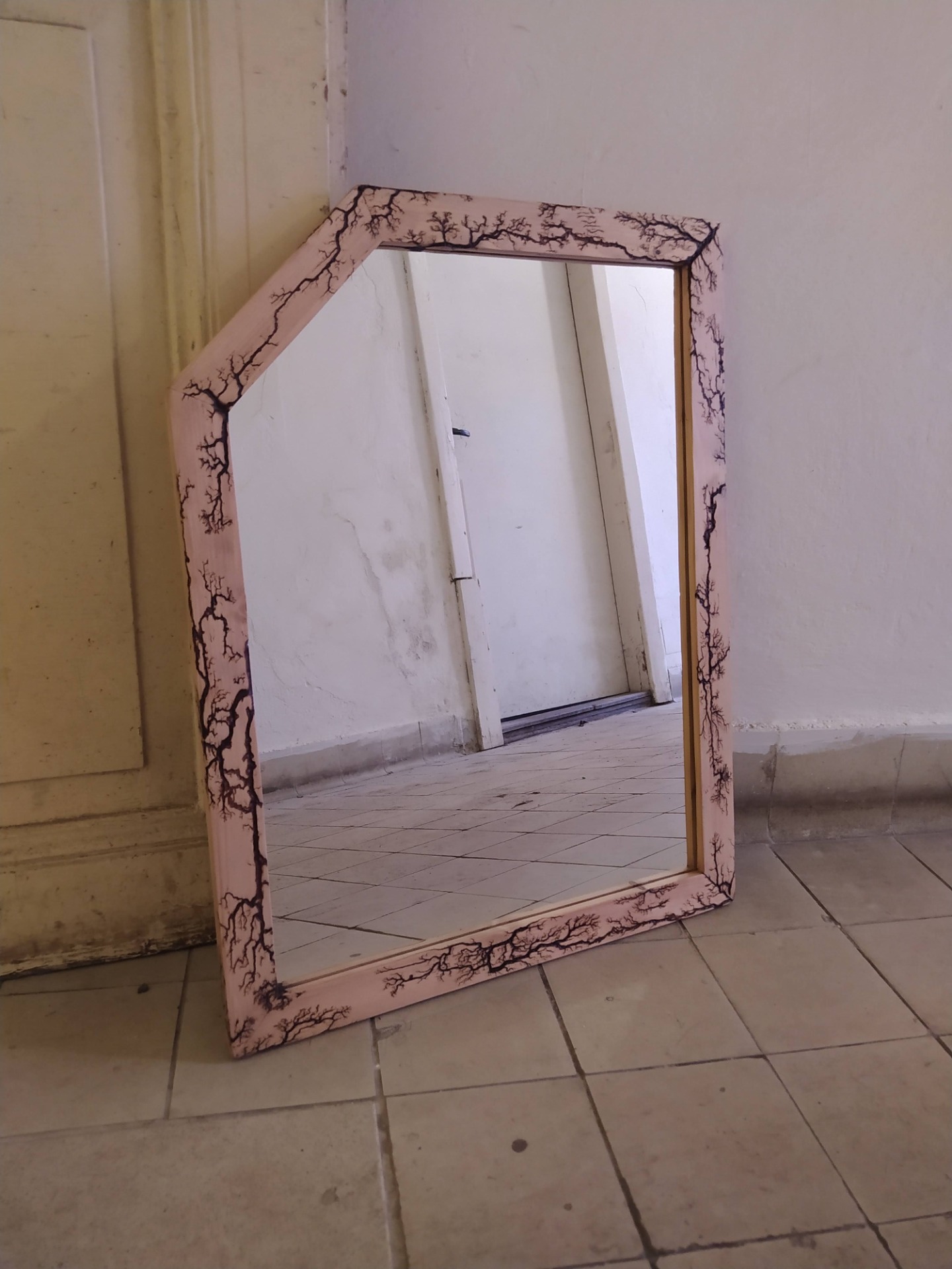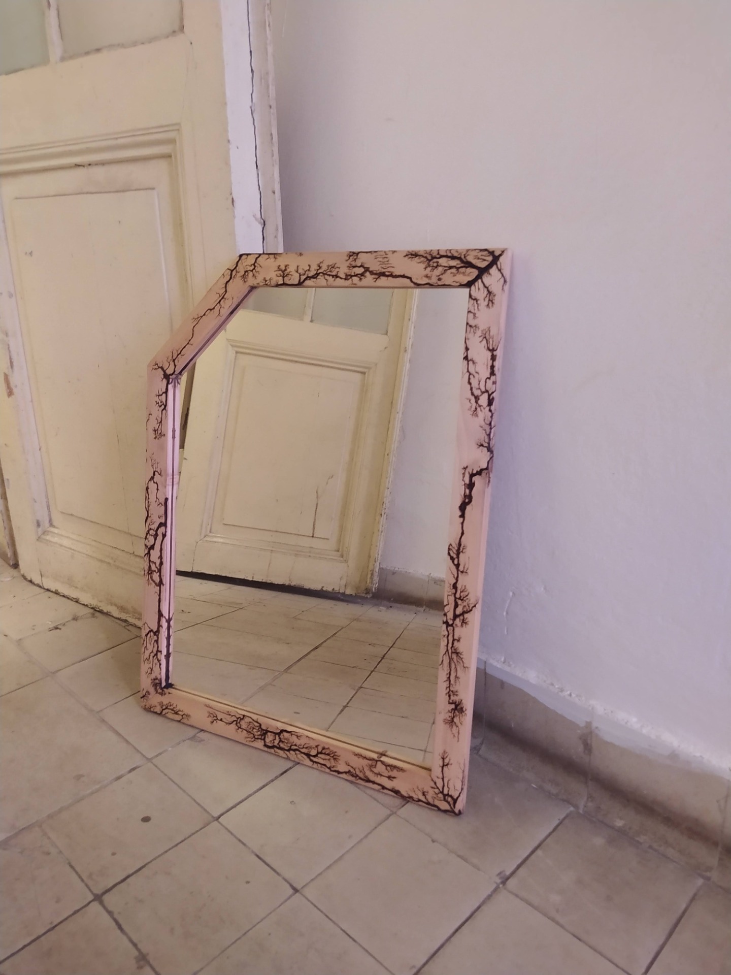 Zrcadlo v dřevěném rámu, který je zdoben metodou vypalování dřeva.