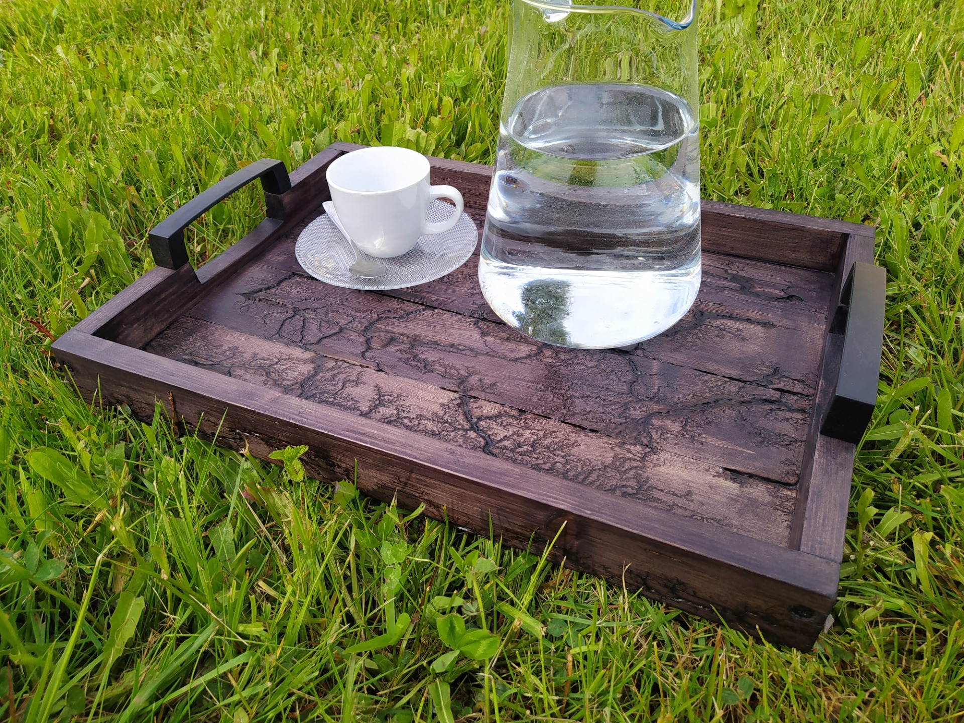 Dřevěný podnos ze smrkového masivu, který je zdoben metodou vypalování dřeva. Podnos je lakovaný.