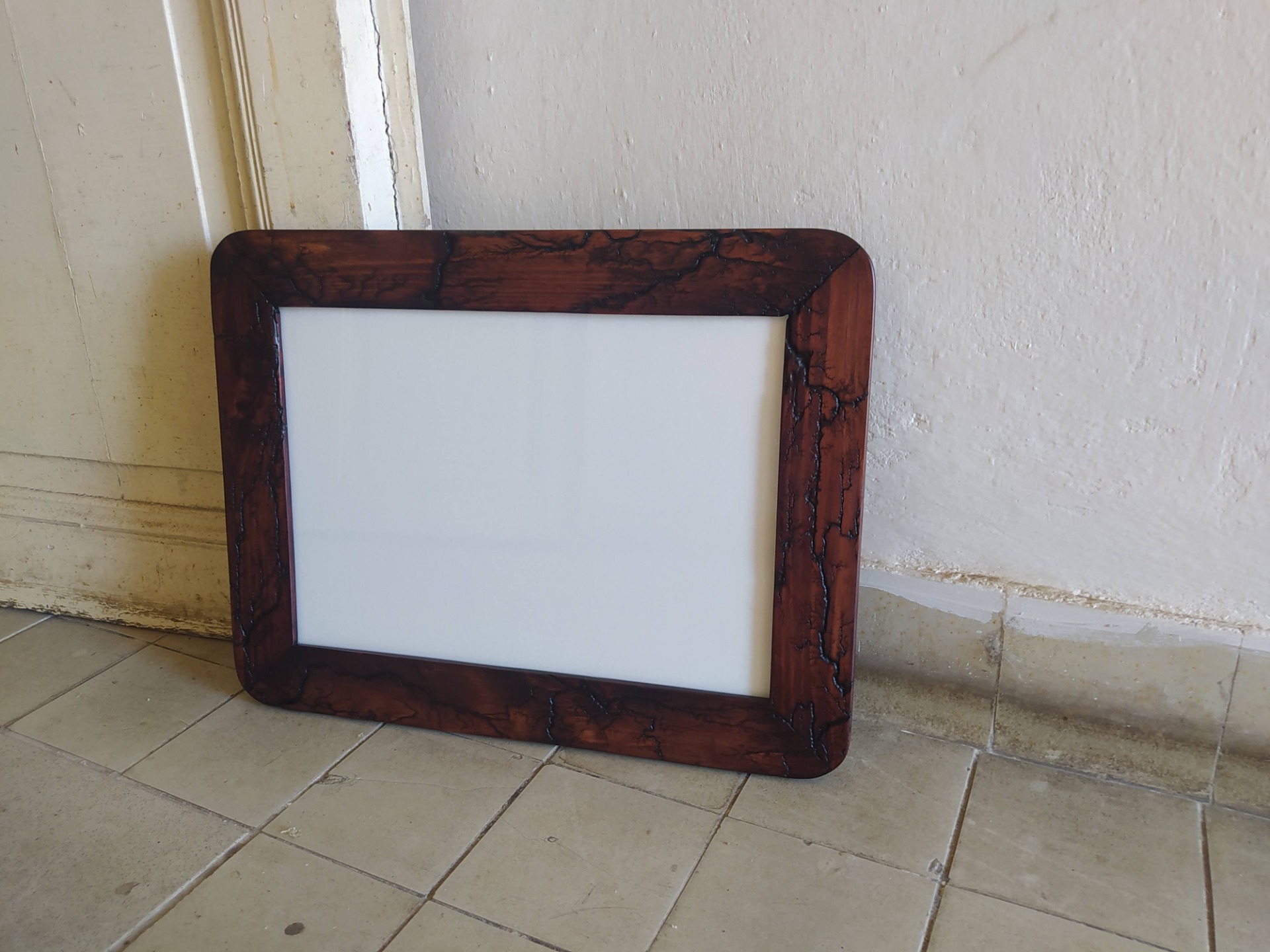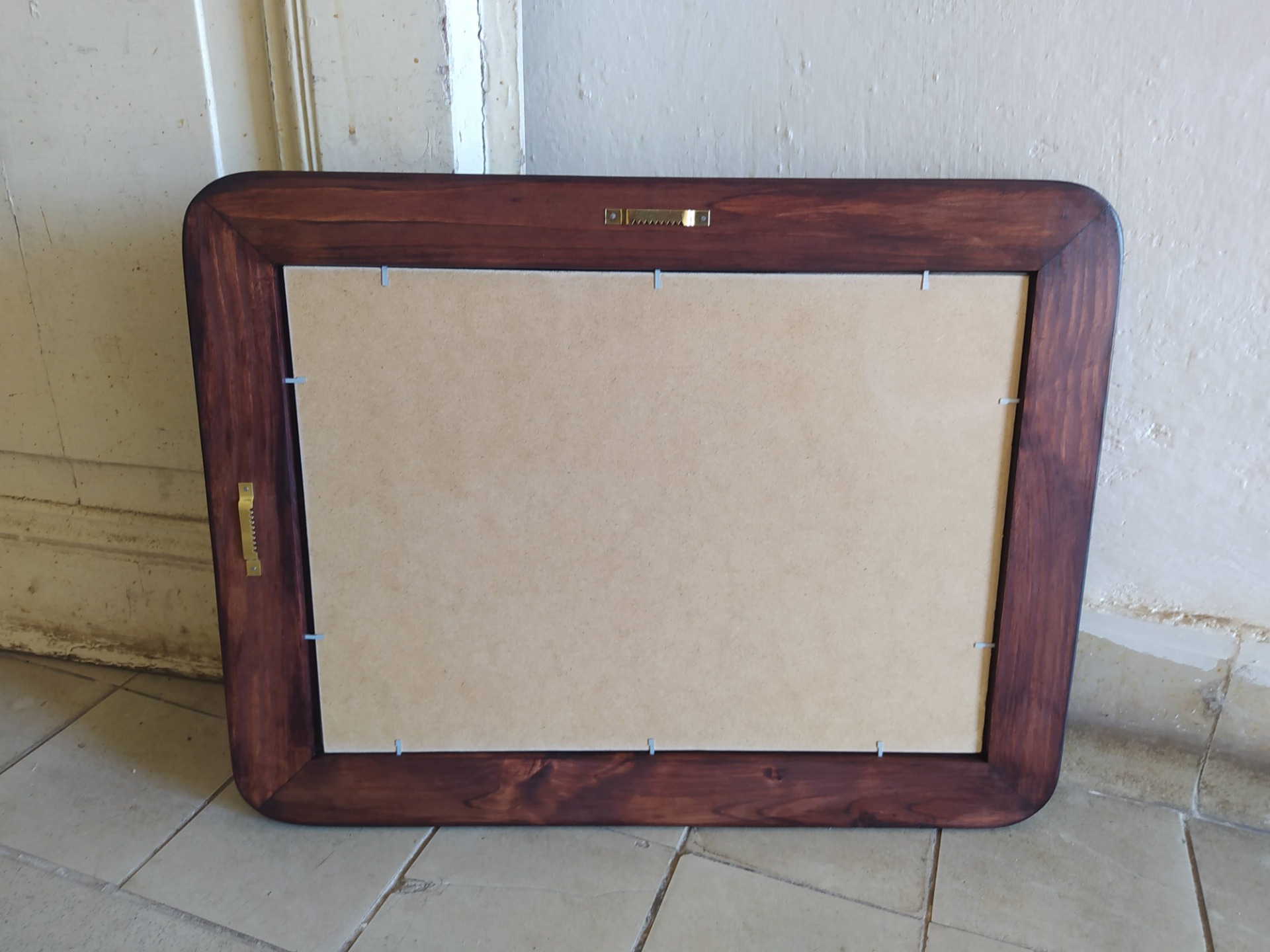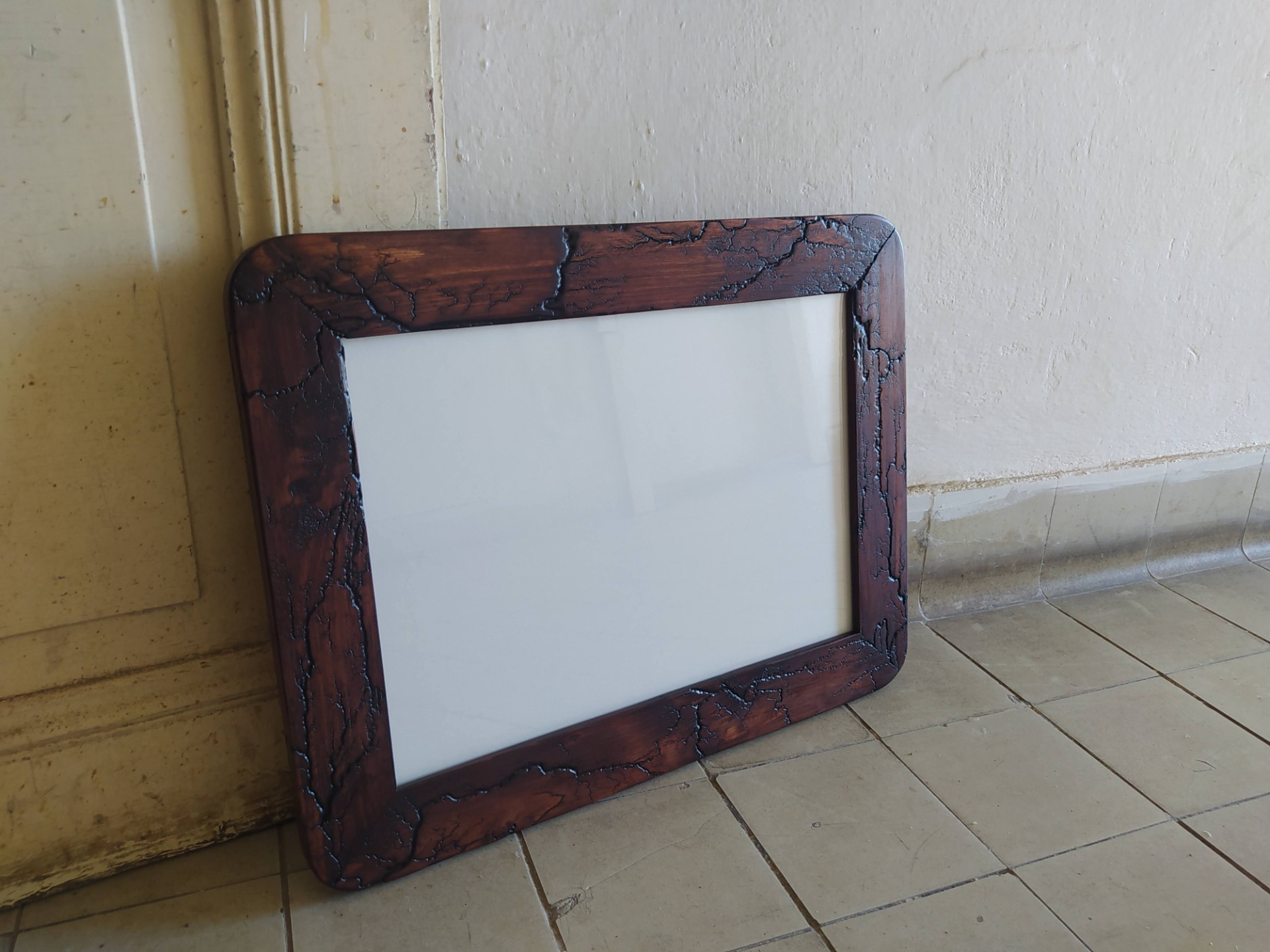 Zdobený dřevěný rám ze smrkového masivu se sklem po vložení obrazu o velikosti 28*18cm.Zadní stranu tvoří MDF a čiré sklo - vše vyjímatelné. Součástí jsou také úchyty pro zavěšení. Rám je lakovaný.