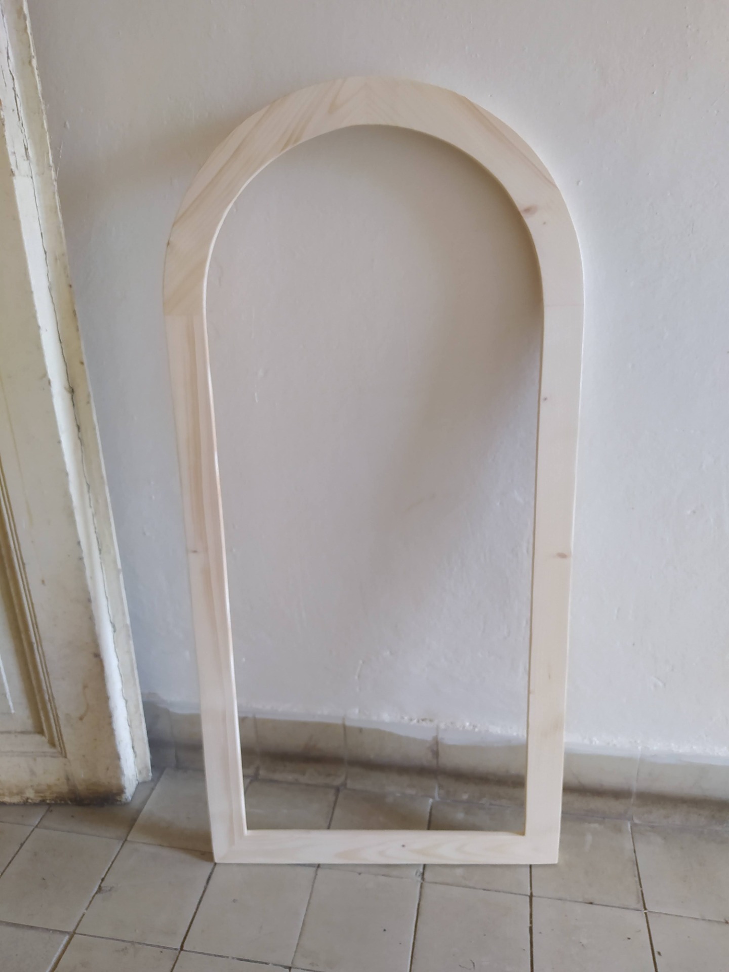 Dřevěný rám s obloukovým tvarem s možností vložení skla, zrcadla, MDF desky nebo překližky.