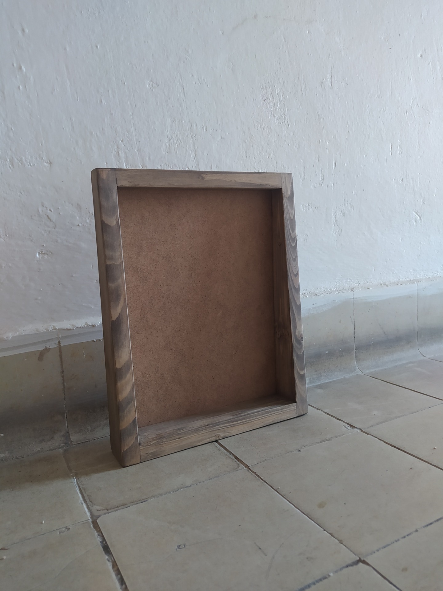 Dřevěný rámeček zkosený s možností vložení fotek, obrázků, dekoračních předmětů či k tvorbě mechových obrazů.