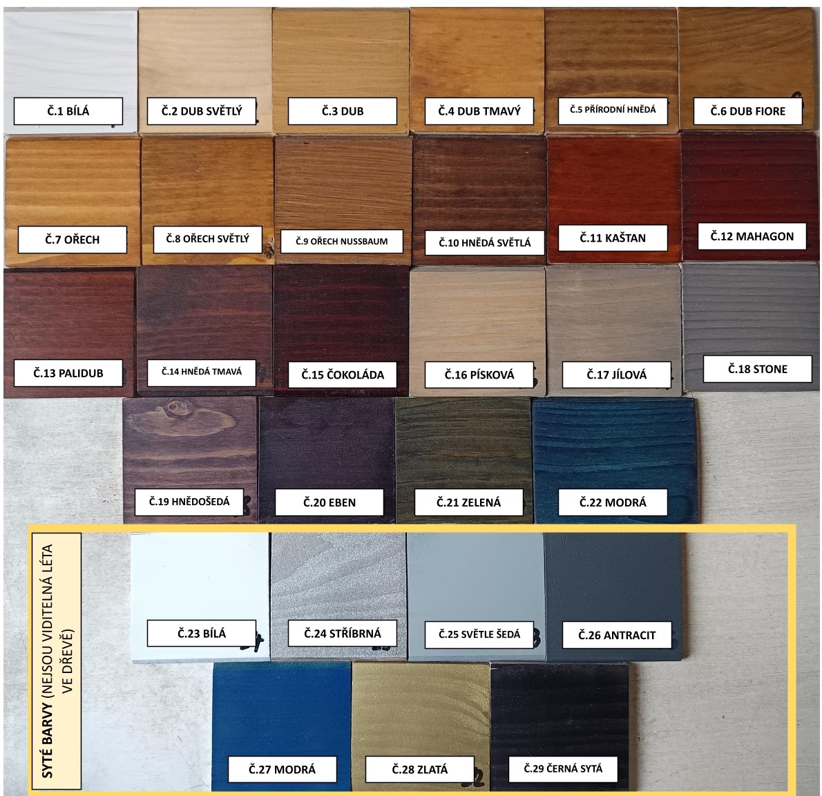 Vyhovuje Vám výrobek rozměrově, ale chtěli byste jinou barvu? Vzhledem k tomu, že rámy si sami vyrábíme, můžeme Vám nabídnout širokou škálu barevných provedení, viz vzorník vlevo.