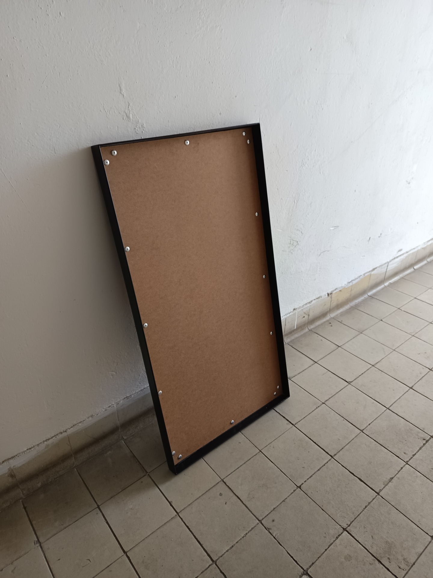 Zadní stranu tvoří MDF deska, napevno přidělaná nýty k rámu (viz foto). Součástí jsou také úchyty pro zavěšení. Rám je lakovaný.