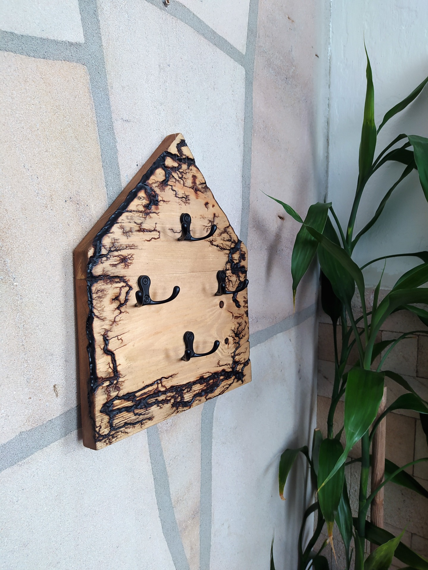 Zdobený dřevěný věšák na zeď vhodný na zavěšení klíčů.