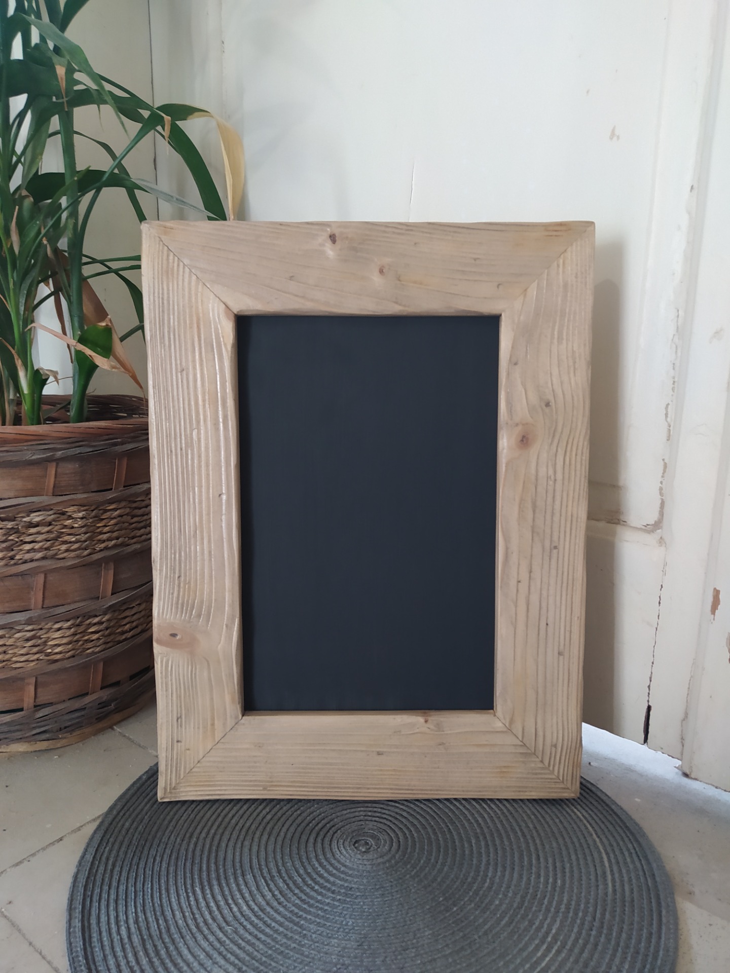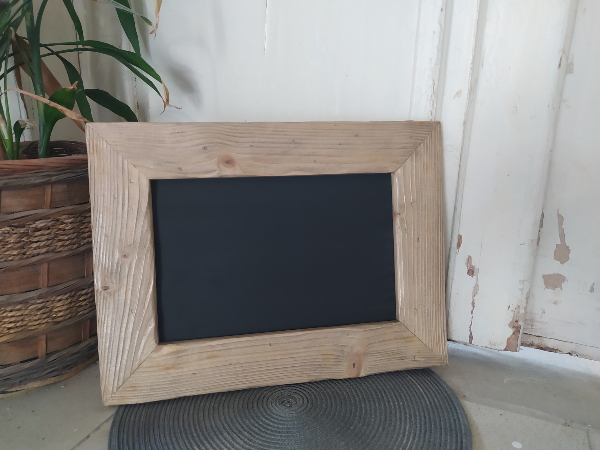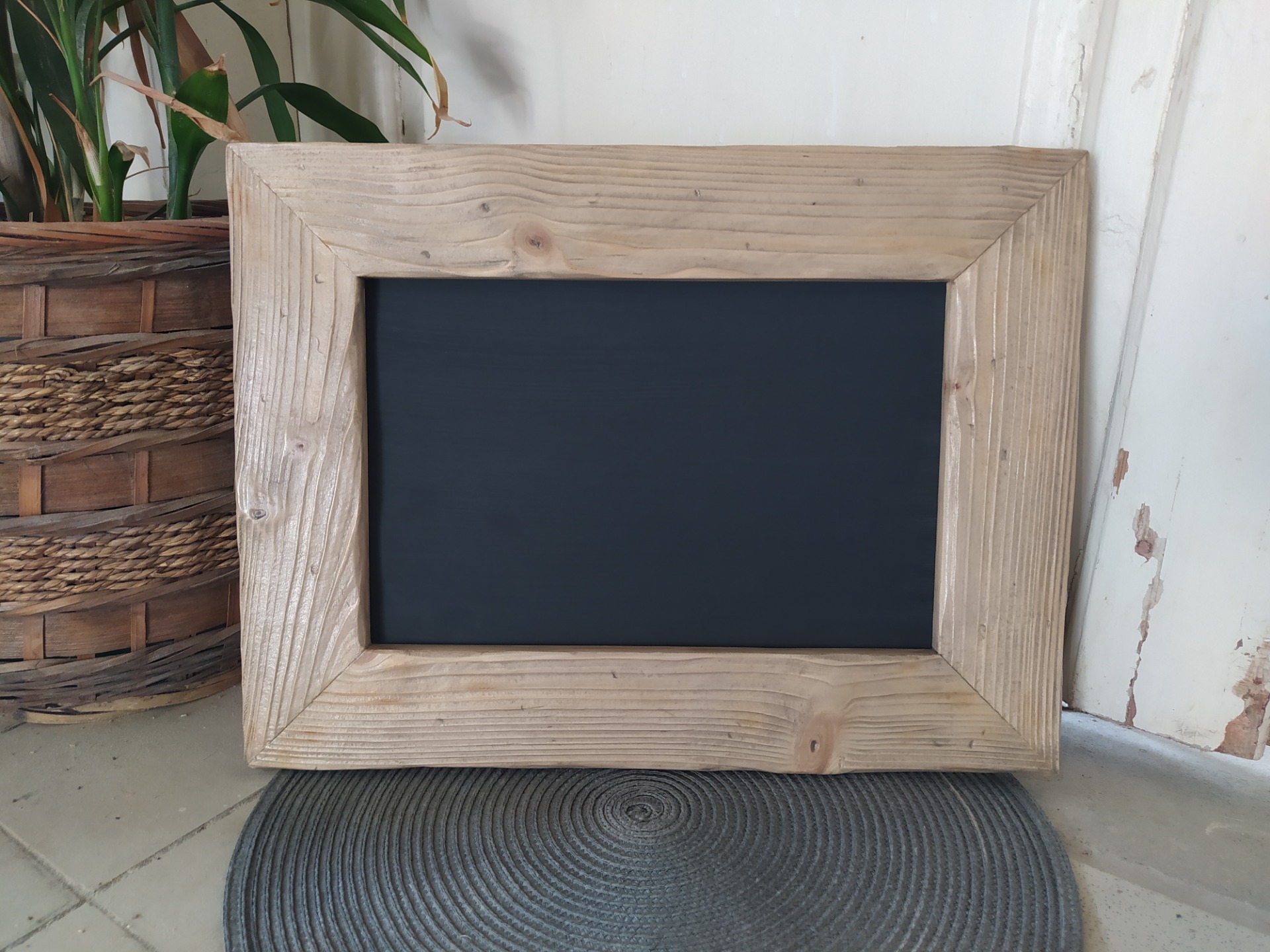Popisovací tabulka v ručně vyrobeném kartáčovaném rámu. Tabulka je popisovatelná křídou nebo křídovým fixem a je vodou omyvatelná. Tabulku lze z rámu vyjmout.