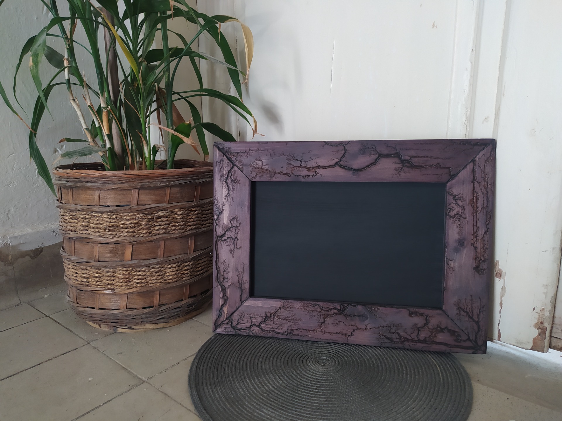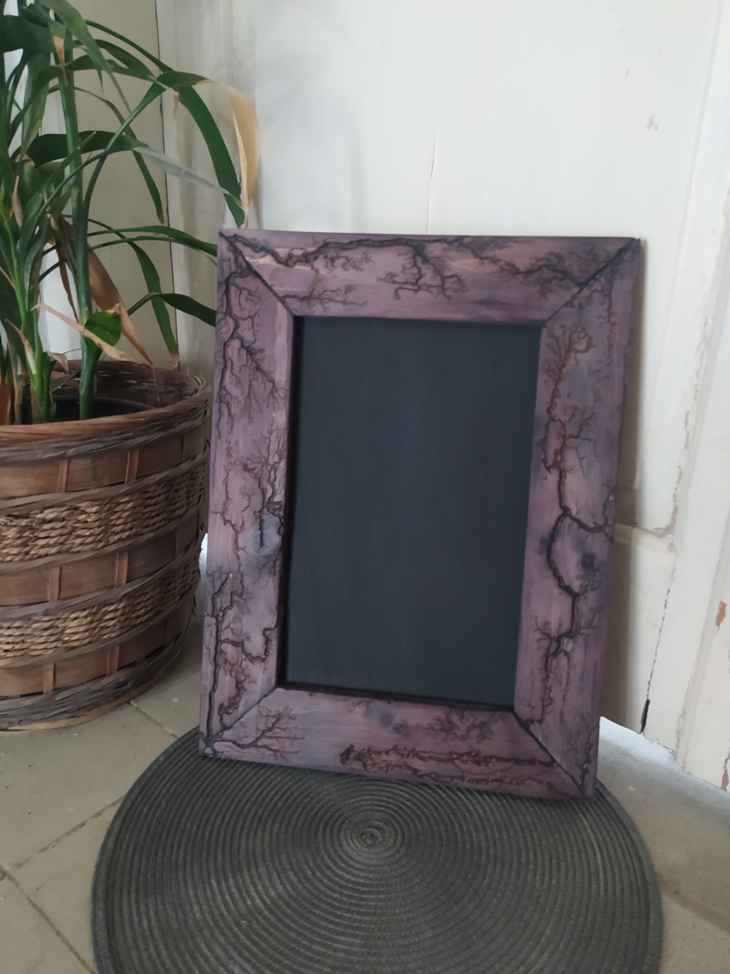 Popisovací tabulka v ručně vyrobeném zdobeném rámu. Tabulka je popisovatelná křídou nebo křídovým fixem a je vodou omyvatelná. Tabulku lze z rámu vyjmout.