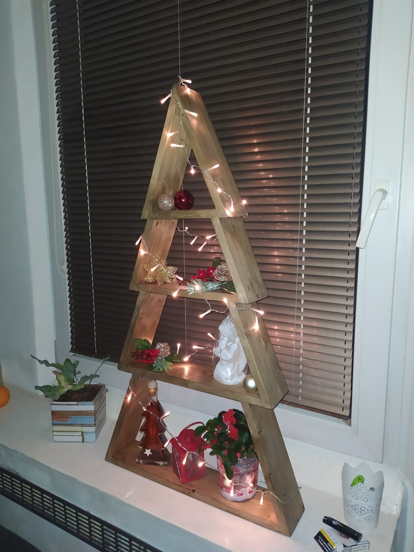 Jednoduchý dřevěný strom, kde si na jednotlivá patra (poličky) můžete dát různé dekorace, chvojí a prostě vše, co máte na Vánocích rádi. Každý si ho může ozdobit k obrazu svému. Je ošetřen i pro umístění venku. Dodáváme pouze stromek bez ozdob, ty jsou pouze ilustrační! :)