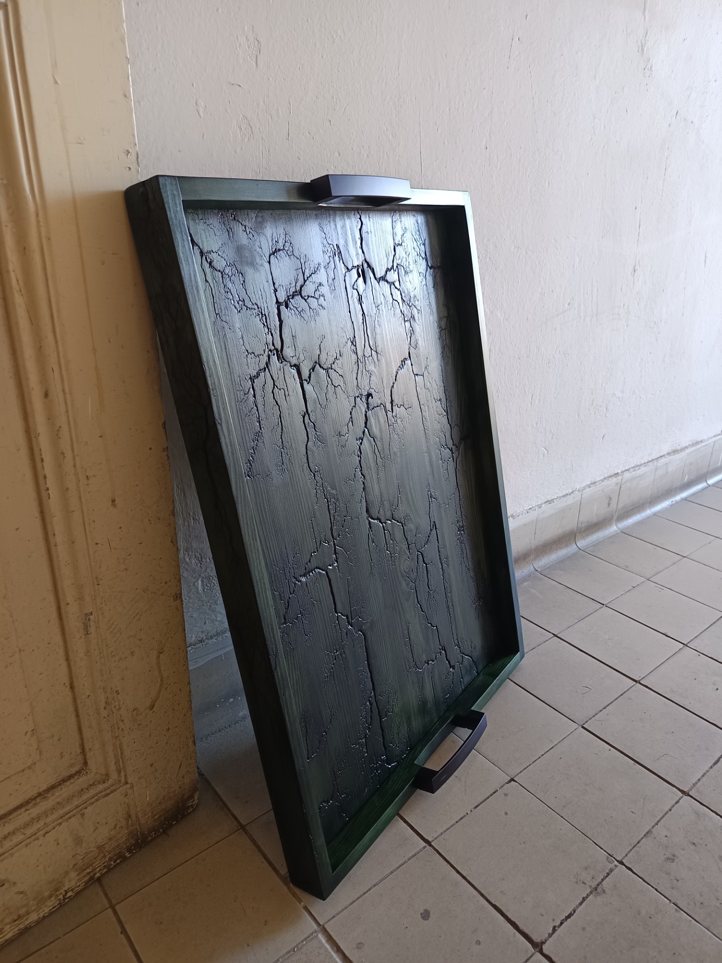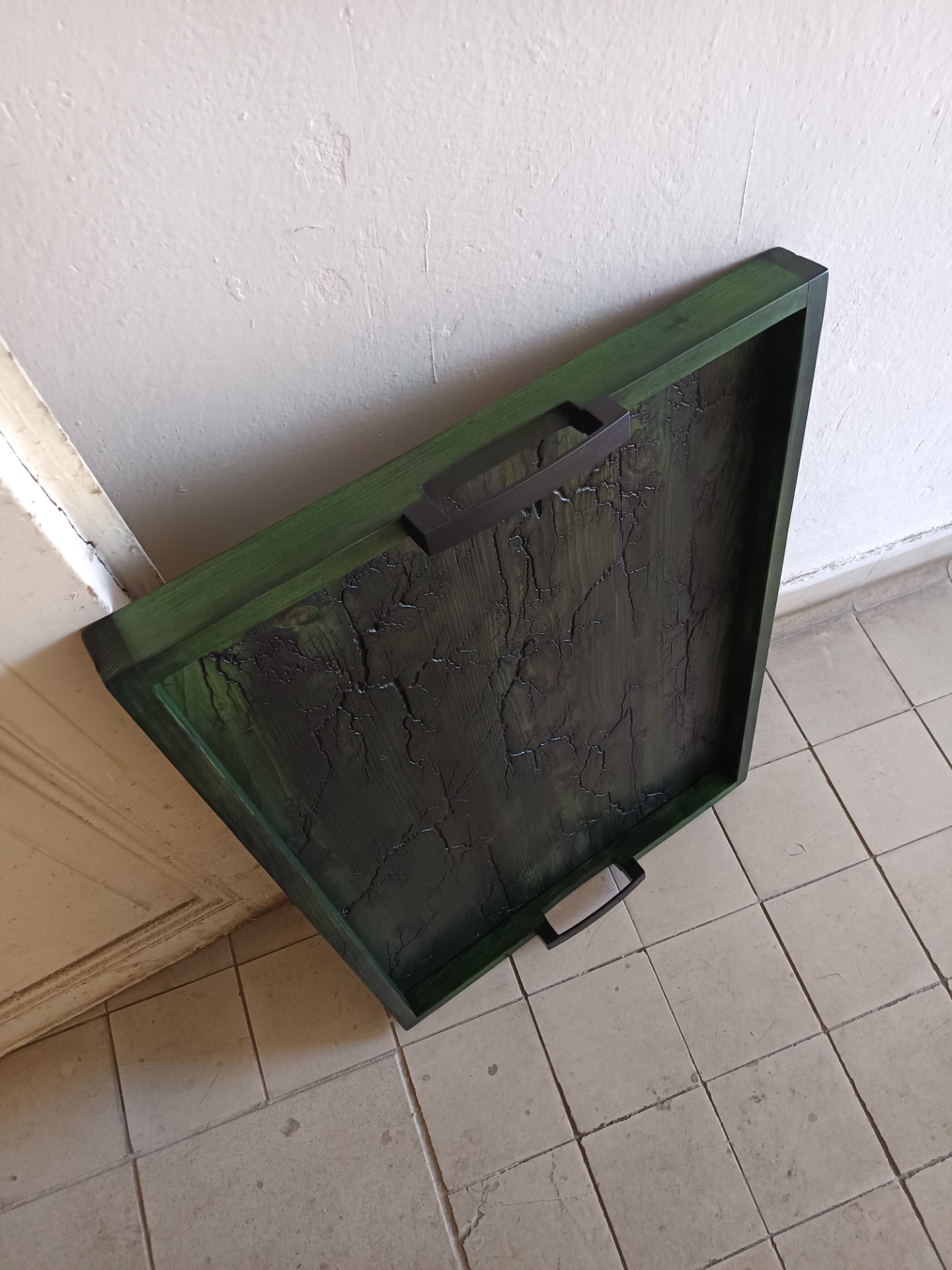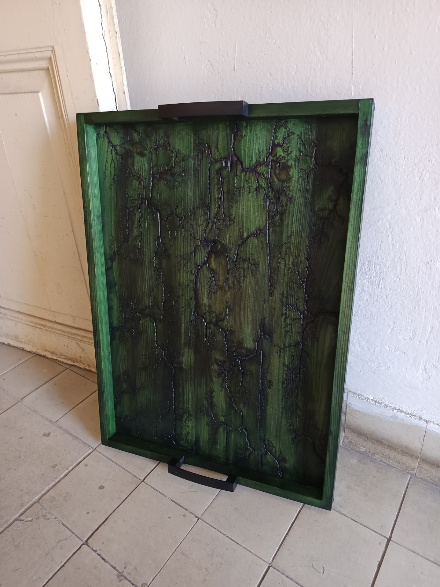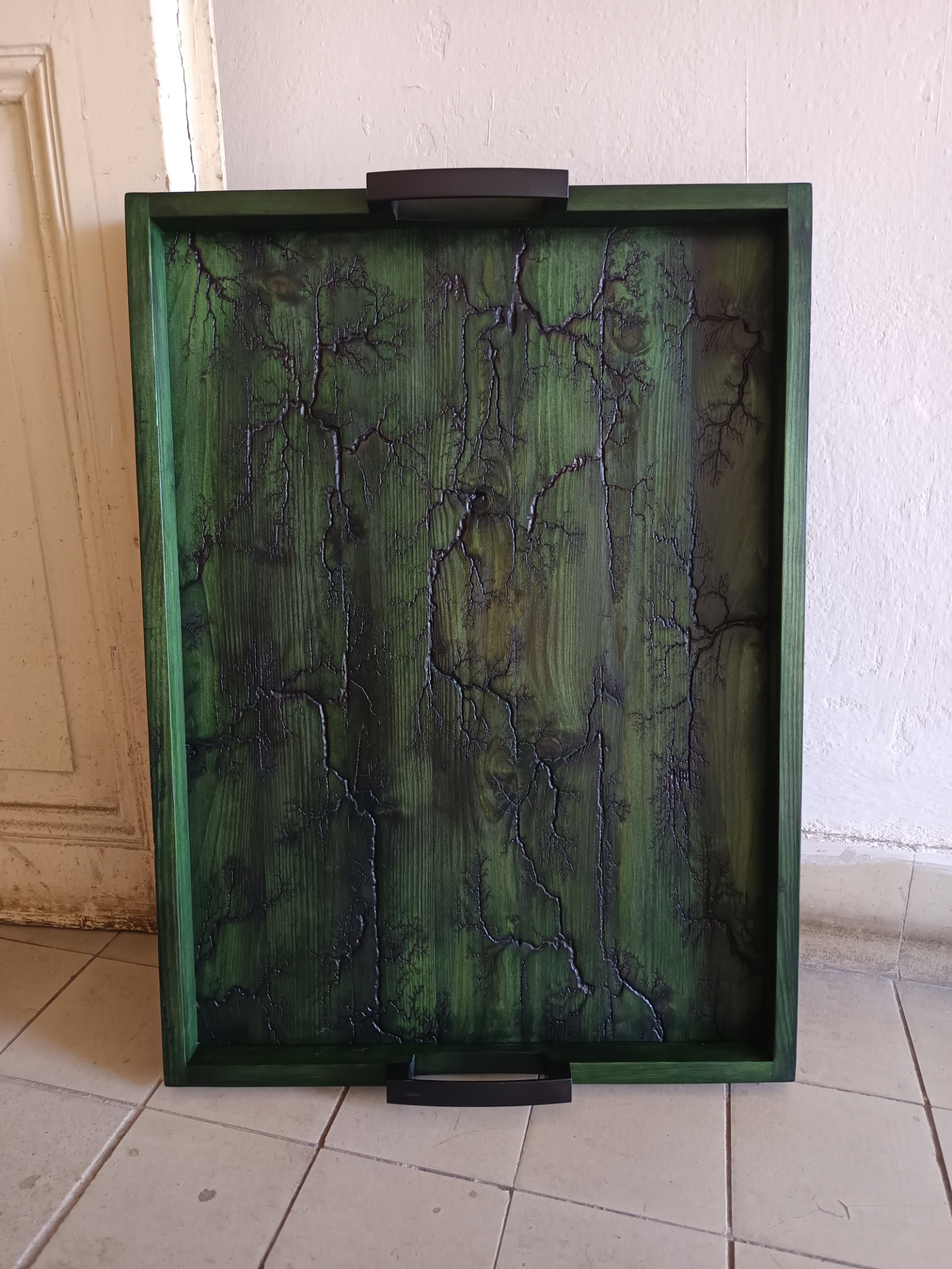 Dřevěný podnos ze smrkového masivu, který je zdoben metodou vypalování dřeva.