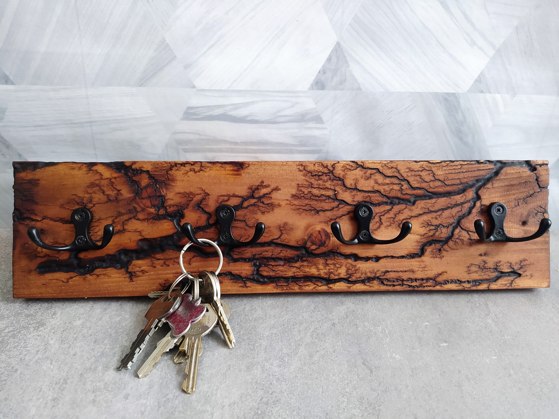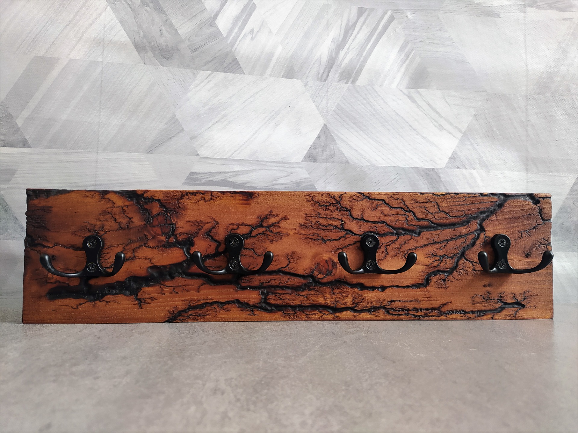 Zdobený dřevěný věšák na zeď. Disponuje 4 dvojúchyty (v černé barvě).