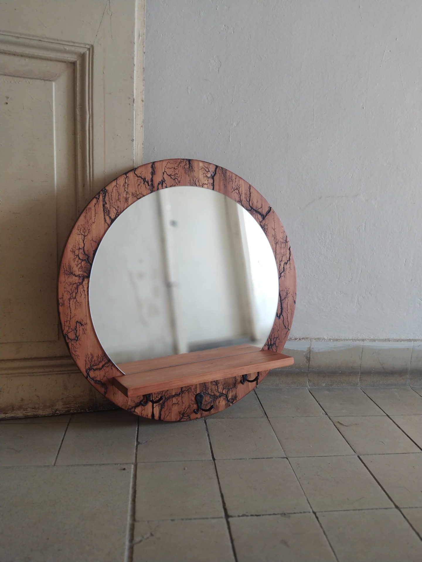 Zrcadlo na kulaté paltformě, která je zdobena metodou vypalování dřeva. Díky praktické poličce (40x10cm) a 3 ks dvoj-věšáků se jedná o kombinaci zrcadla, věšáku a úložného prostoru. Součástí jsou také úchyty pro zavěšení. Rám je lakovaný.