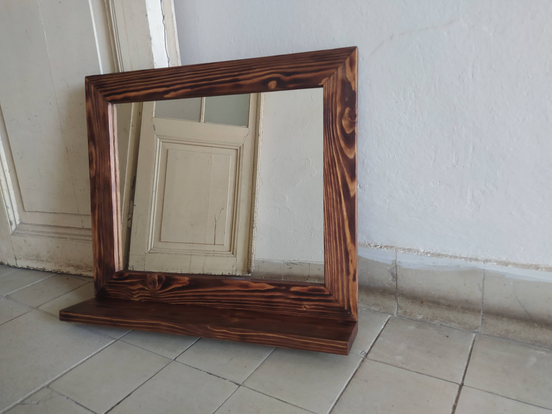 Zrcadlo s dřevěným kartáčovaným rámem a poličkou. Na poličku (60x10 cm) můžete odložit klíče, dopisy nebo třeba koupelnové drobnosti.